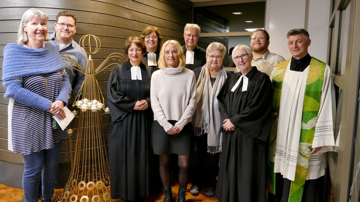 Foto: Superintendentin Saskia Karpenstein (3.v.l.) verabschiedete Pfarrerin Kirsten Winzbeck (4.v.l.) mit Mitgliedern des Presbyteriums und Hauptamtlichen aus ihrem Dienst in der Evangelischen Stadt-Kirchengemeinde Marl.