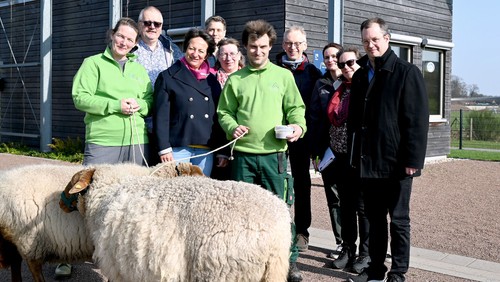 Foto: Mit einer kleinen Delegation besichtigte Superintendentin Saskia Karpenstein (v.2.v.li.) das Emscherland und ließ sich von Moritz Herbst, Emschergonossenschaft (hintere Reihe), und Dr. Dietmar Kelhbreier, Geschäftsführer Diakonie (rechts), die blaugrüne Oase zeigen. Mit dabei auch die beiden Diakonie-Schafe "Zimt" und "Schnecke".
