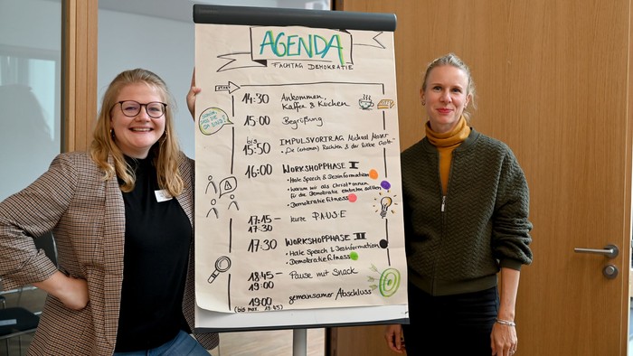 Foto (v.l.n.r.): Die Bildungsreferentinnen Janina Keßler (Ev. Kirchenkreis Gladbeck-Bottrop-Dorsten) und Julia Borries (Ev. Kirchenkreis Recklinghausen) hatten zum Fachtag Demokratie eingeladen.