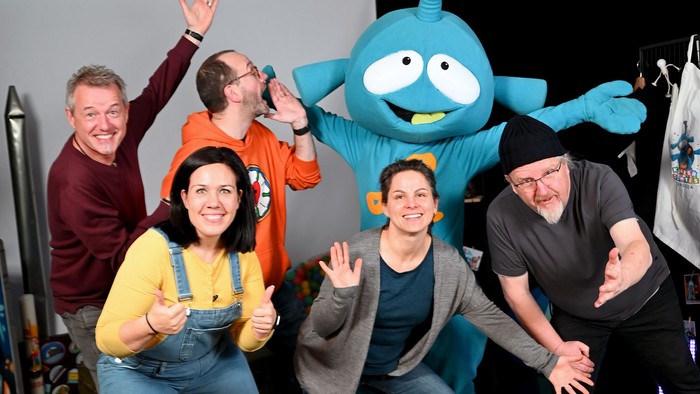 Foto: Die Crew von "Neues von Logodor & Melissa" freute sich über den Besuch von Liederpfarrer Bastian Basse (orangefarbener Pulli).