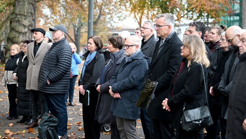 Foto: Zahlreiche Vertreterinnen und Vertreter der Stadtgesellschaft, Politik und Kirche gedachten am Mahnmal gegenüber dem Finanzamt der Pogromnacht 1938.