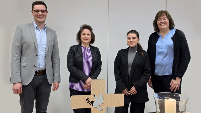 Recklinghausen - Im Anschluss an die Andacht für die Mitarbeitenden im Haus des Kirchenkreises stellte der stellv. Verwaltungsleiter Timo Müller (li.) Frau Natalia Komar (Foto: 2. von links) als neue Kollegin offiziell vor. Frau Komar ist seit dem 1. Februar 2026 im Kreiskirchenamt im Bereich Meldewesen tätig und wird dort von Delia Murawski eingearbeitet, die in naher Zukunft nach über 30 Jahren Dienst in den wohlverdienten Ruhestand verabschiedet wird.