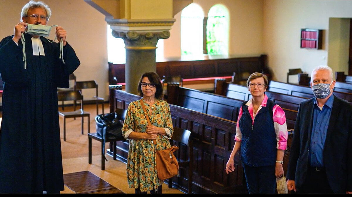 „Durch die Corona-Krise mussten wir die Besuche in den Pflegediensteinrichtungen stoppen“, erzählt Hospizdienst-Koordinator Pfarrer Ulrich Radke im Interview mit Presbyter Klaus Tykwer, der das Interview als Video auf dem YouTube-Kanal der Kirchengemeinde veröffentlichte. Die Zeit, bis wieder Besuche unter entsprechenden Hygiene- und Abstandsbedingungen möglich waren, nutzte das Hospizdienst-Team, um die Gesichtsmasken unter die Menschen zu bringen.